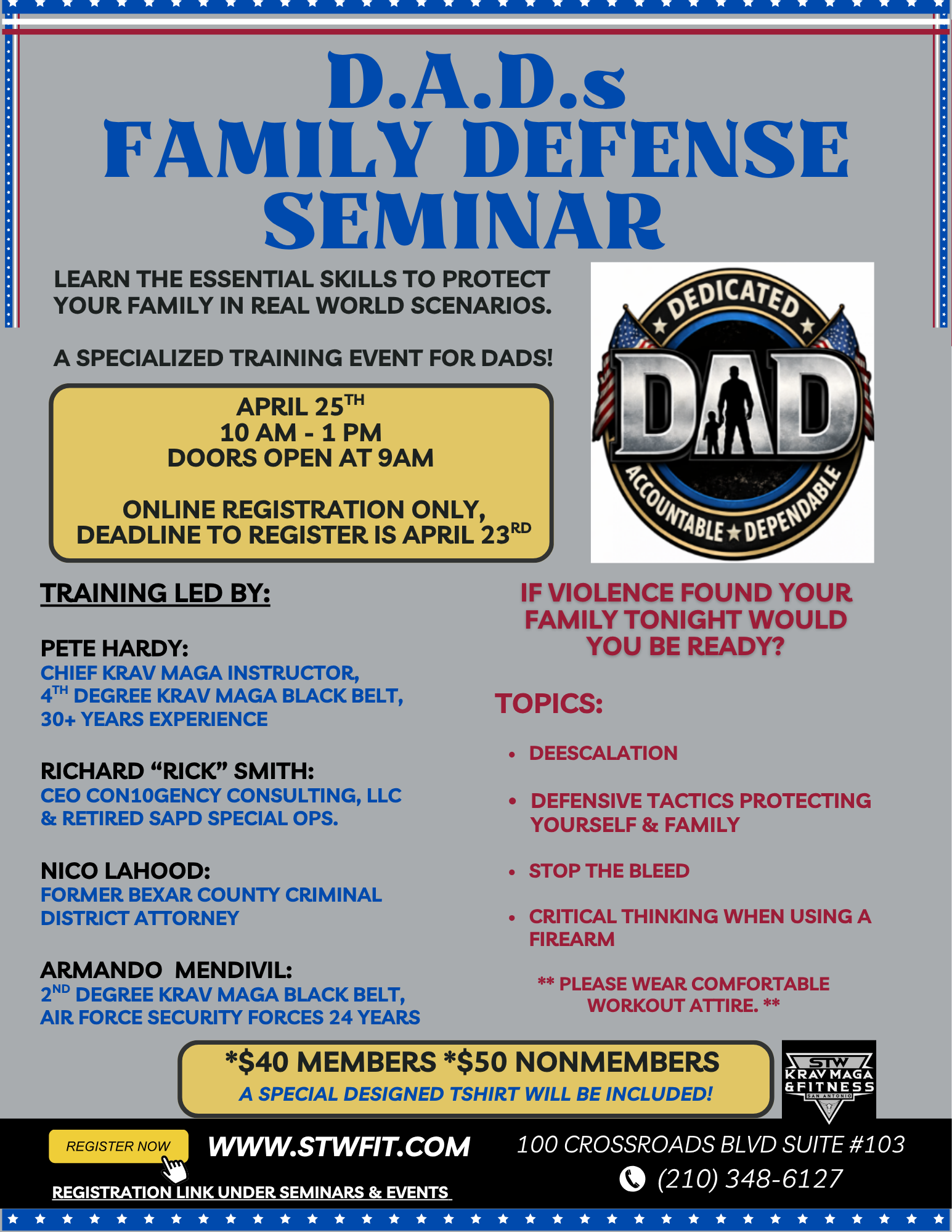 This isn’t theory—it’s TACTICAL, real-world application led by a POWERHOUSE TEAM of elite instructors, including a Chief Krav Maga Instructor, a retired SAPD Special Ops officer, a former Criminal District Attorney, and a 24-year Air Force Security Forces veteran.